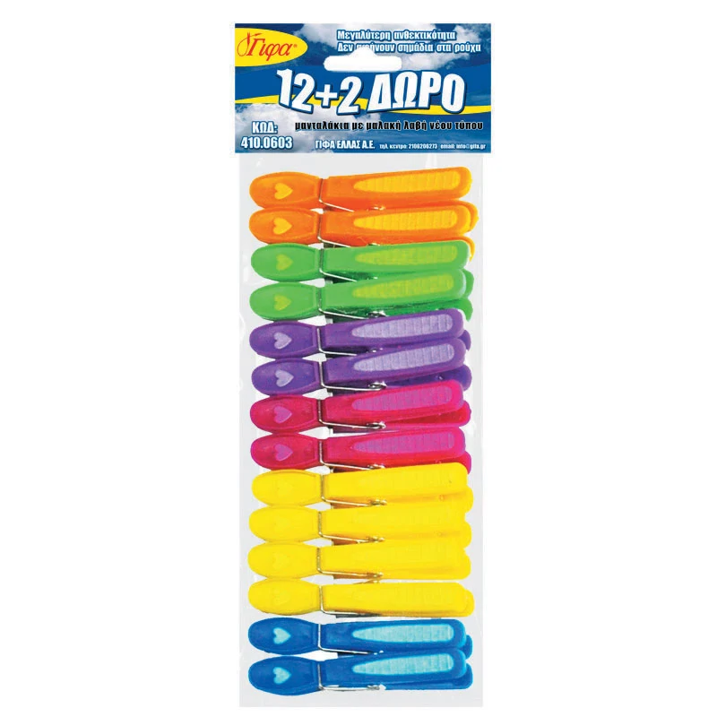 Τα ΓΙΦΑ Μανταλάκια 12+2 δώρο είναι ανθεκτικά και πρακτικά, ιδανικά για στερέωση ρούχων στο σχοινί ή σε κρεμάστρες. Η εργονομική κατασκευή τους εξασφαλίζει σταθερό κράτημα χωρίς να αφήνει σημάδια στα ρούχα. Η προσφορά 12+2 δώρο προσφέρει επιπλέον αξία και οικονομία για το σπίτι.